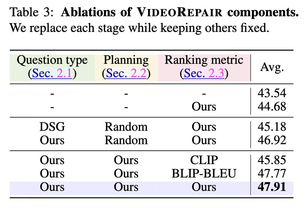 We observe that VideoRepair improves the initial videos from all T2V models (VideoCrafter2, T2V-turbo, and CogVideoX-5B) in all three splits, with relative improvements of +8.16%, +8.69%, and +15.87%, respectively.