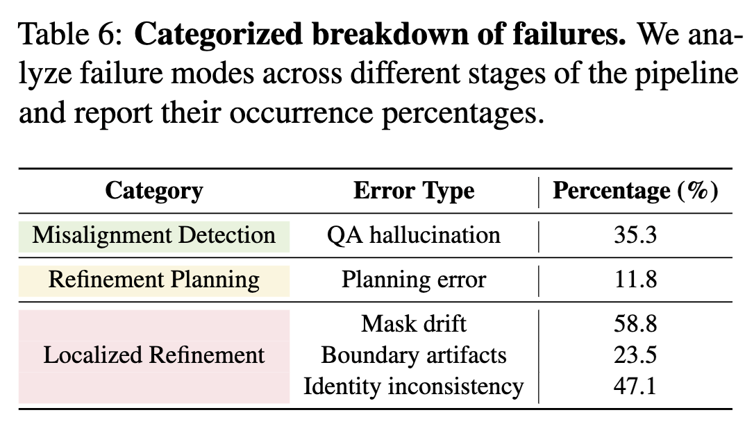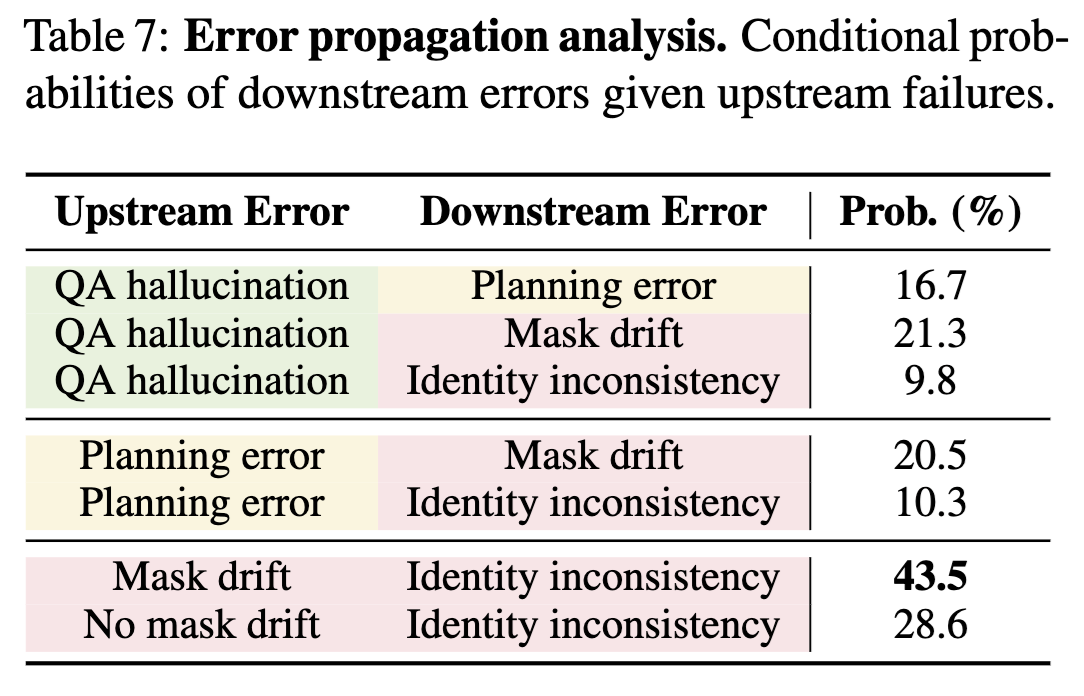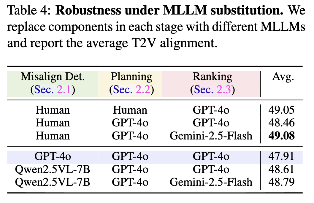 VideoRepair consistently outperforms all baselines across all four evaluation splits in text-video alignment, achieving relative gains of +6.22%, +7.65%, and +3.11% over VideoCrafter2, T2V-turbo, and CogVideoX-5B, respectively. We highlight the quality and consistency performance in red if it deteriorates by more than 1% from the original performance.